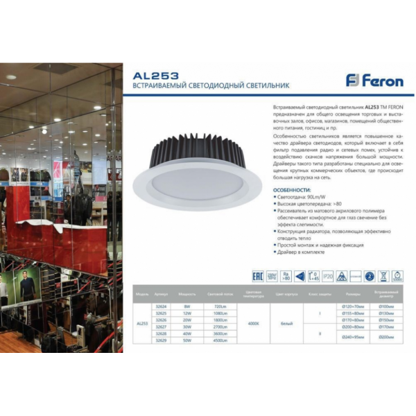 Светильник встраиваемый Feron светодиодный 20W, 1800Lm, 4000K, 90 градусов, белый, AL253 с драйвером в комплекте