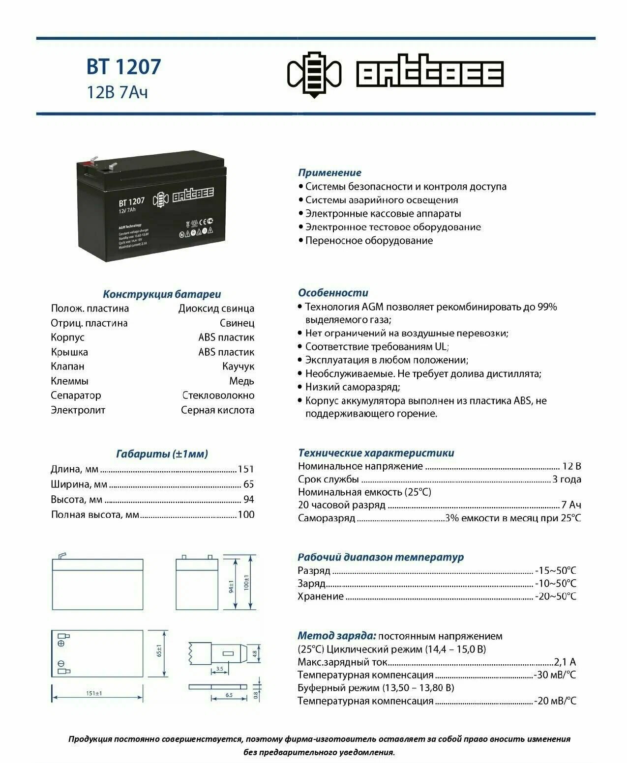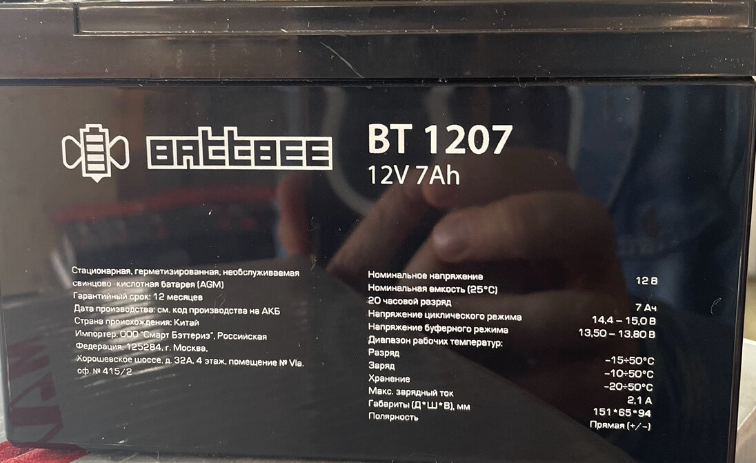 Аккумулятор BATTBEE BT 1207 12V 7Ah AGM VRLA для ИБП, UPS, освещения, для пожарной и охранной сигнализации интересное: