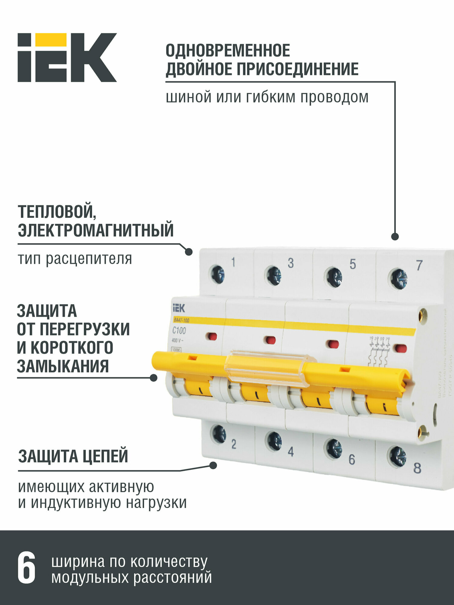 СохранитьВыключатель автоматический модульный 4п C 100А 10кА ВА47-100 IEK MVA40-4-100-C интересное: