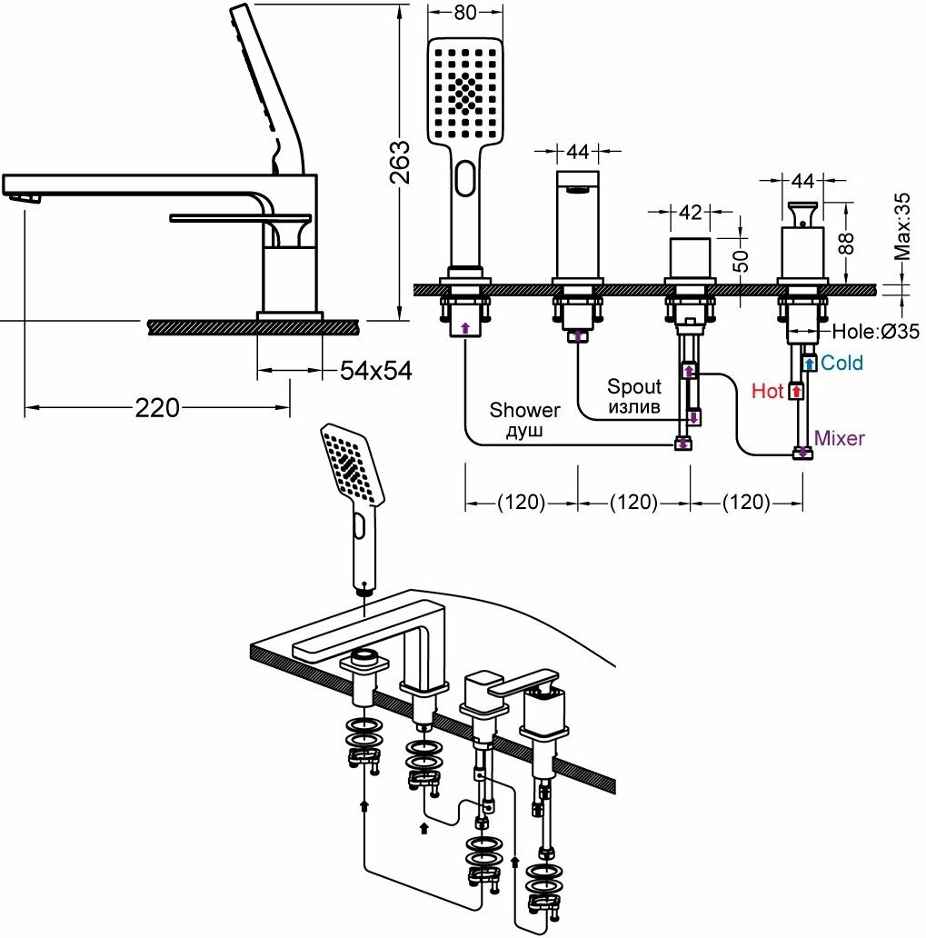 | Комплектация | Смеситель врезной - 1 шт. Излив врезной (латунный) - 1 шт. Блок управления режимами / врезной - 1 шт. Держатель ручной лейки / врезной - 1 шт. Ручная лейка / 3-х режимная (пластик) - 1 шт. Шланг душа 1,5 м - 1 шт. Инструкция - 1 шт. |