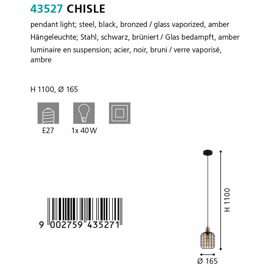 Купить Eglo CHISLE Подвесной потолочный светильник (люстра) CHISLE, 1Х40W, E27, H1100, Ø165, сталь/стекло, черный 43527 (5 шт.)