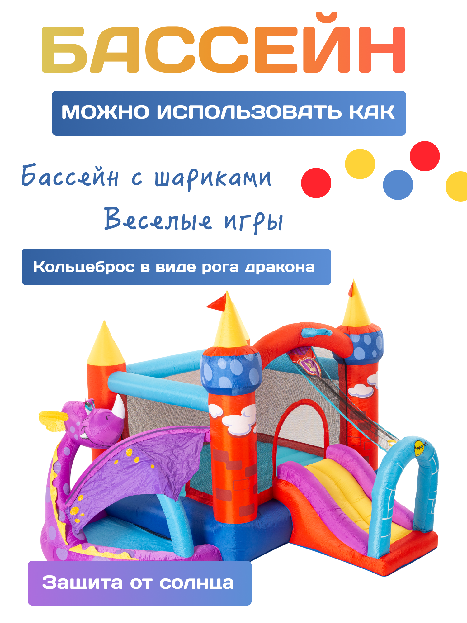 Детский надувной батут для дома и улицы Happy Hop "Дракоша", с горкой, с защитной сеткой, 350х350х245 см