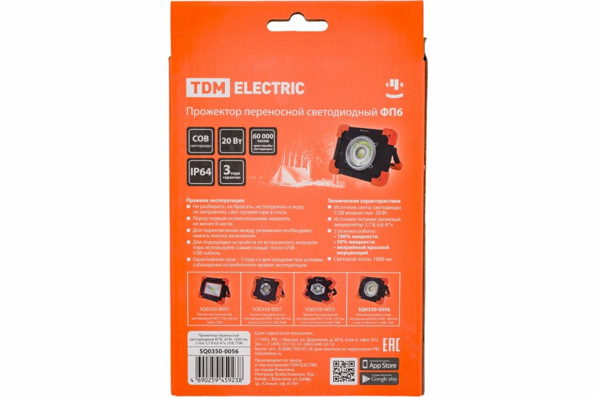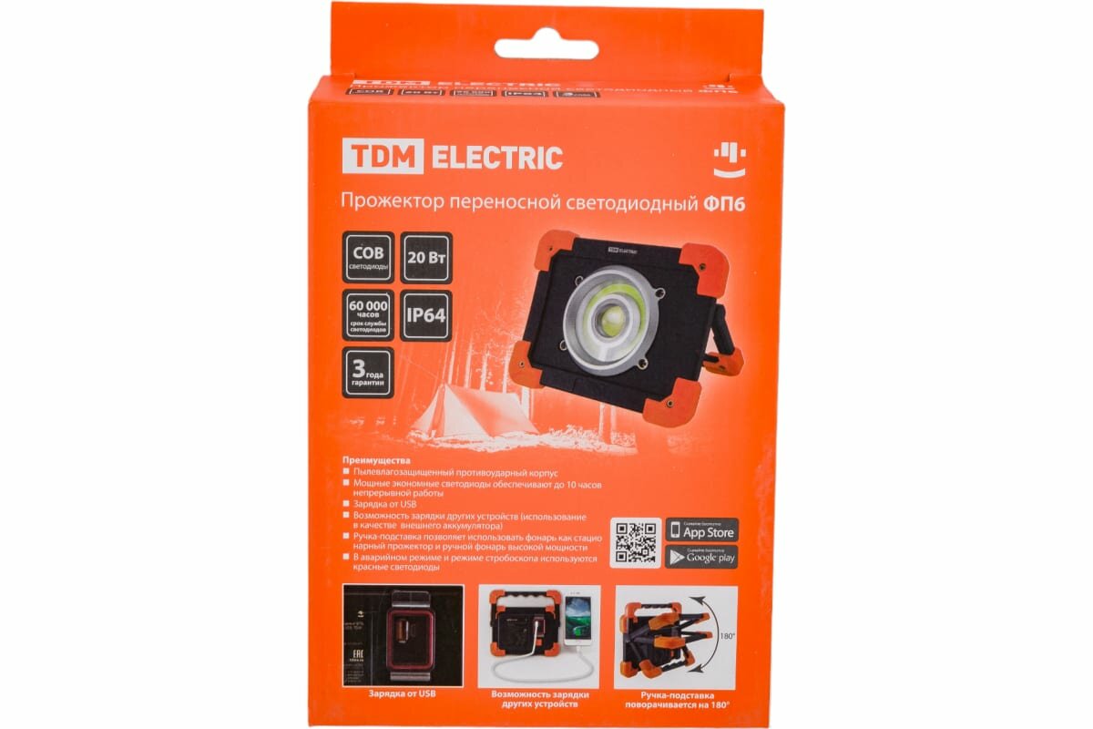 TDM SQ0350-0056 Прожектор переносной светодиодный ФП6, 20 Вт, 1800 лм, Li-Ion 3,7 B 6,6 A ч, USB,