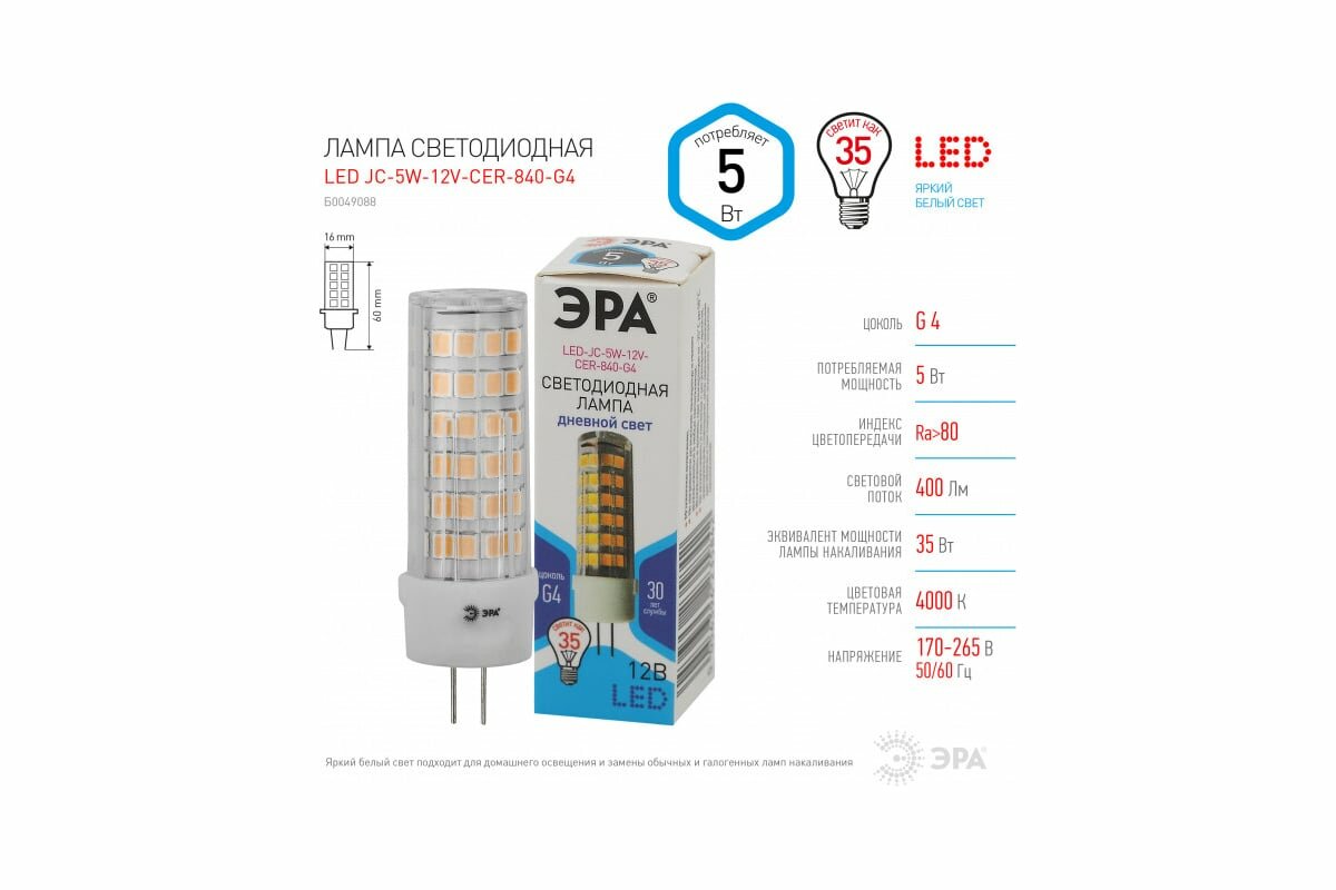 Купить Лампочка светодиодная ЭРА STD LED JC-5W-12V-CER-840-G4 G4 5Вт керамика капсула нейтральный белый свет арт. Б0049088 (1 шт.)