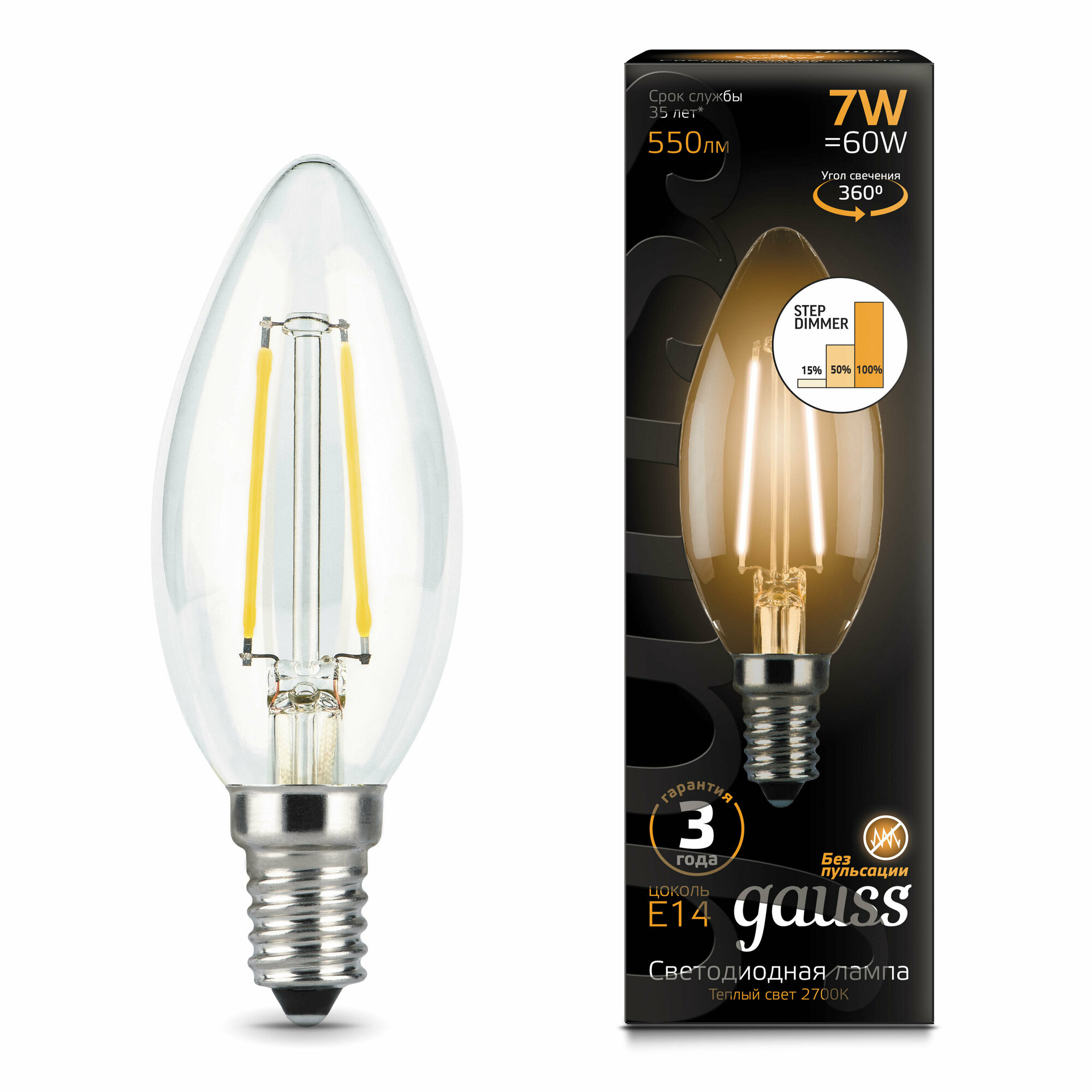 Лампа светодиодная филаментная LED 7 Вт 550 лм 2700К AC185-265В E14 свеча теплая шаговое диммирование выключателем Black Filament, GAUSS 103801107S (1 шт.) интересное: