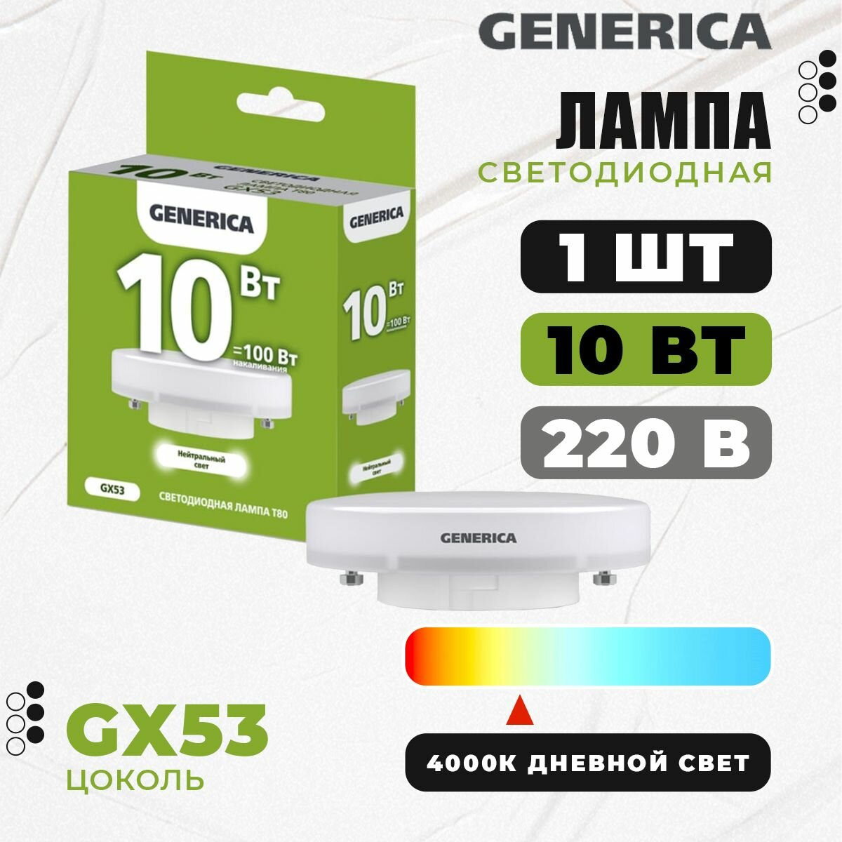 Лампочка светодиодная GENERICA 10Вт=100Вт 4000К нейтральный свет GX53 T80 таблетка (комплект из 10 шт.)