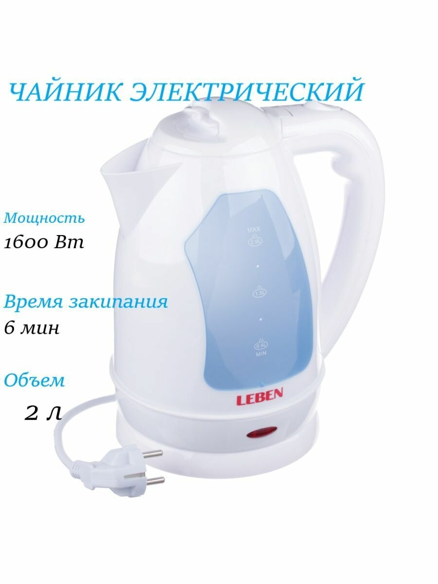 Чайник электрический 2, 0 л LEBEN, 1600 Вт, пластик, белый интересное:
