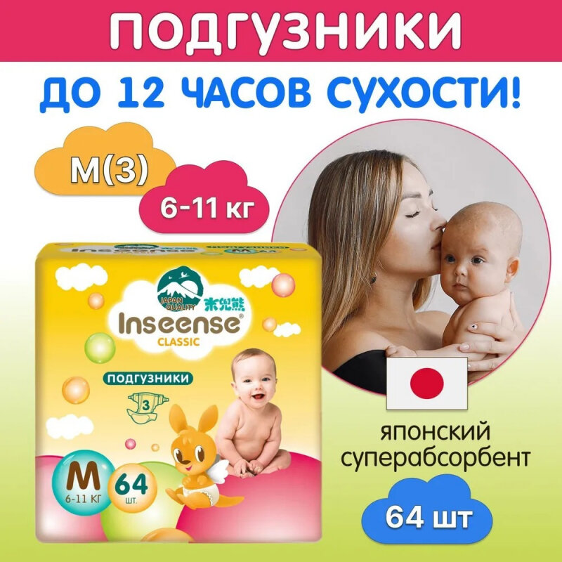 Inseense подгузники Classic M (6-11 кг), 64 шт., желтый интересное: