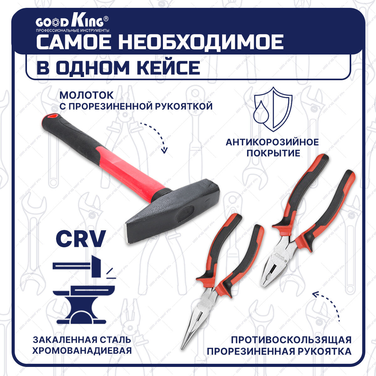 | Инструменты в комплекте | бокорезы / клещи / ключи гаечные / кусачки / молоток / отвёртки / трещотка |