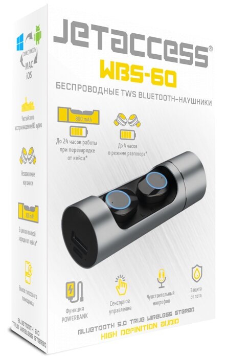 Беспроводные BLUETOOTH наушники JETACCESS WBS-60 черный-серый(BT5.0,сенс.упр.,800mAh, powebank)
