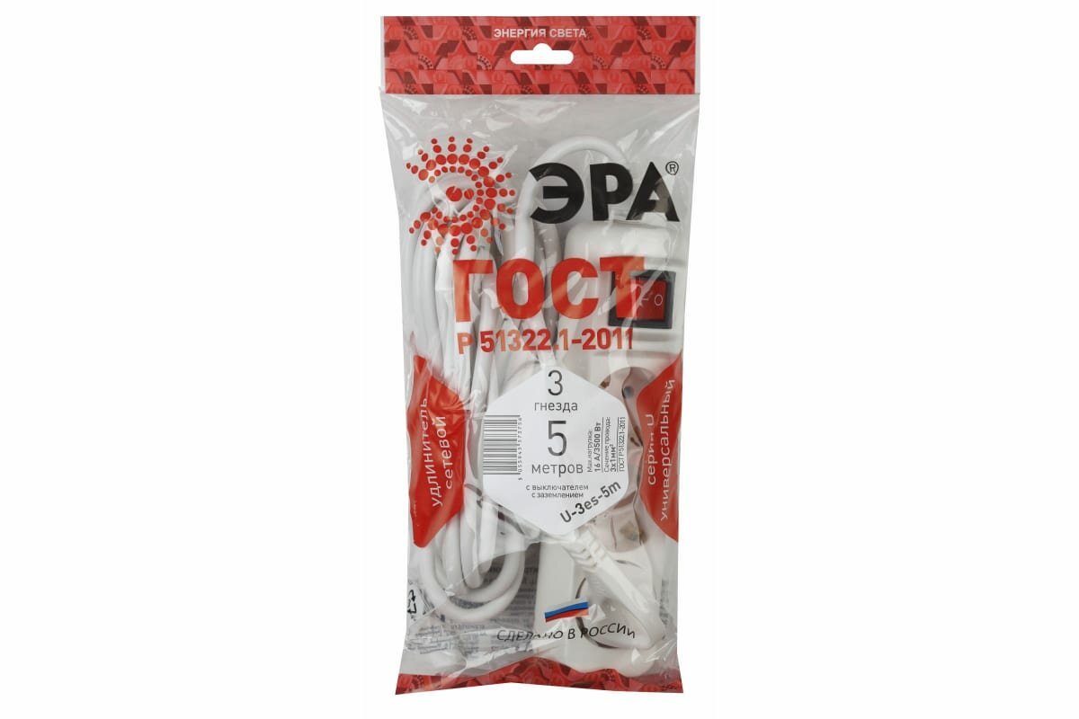 Купить ЭРА Б0028379 Удлинитель U-3es-5m-3x1 с заземлением с выключателем 3 гнезда 5 м {полипропилен, 3х1 мм2}