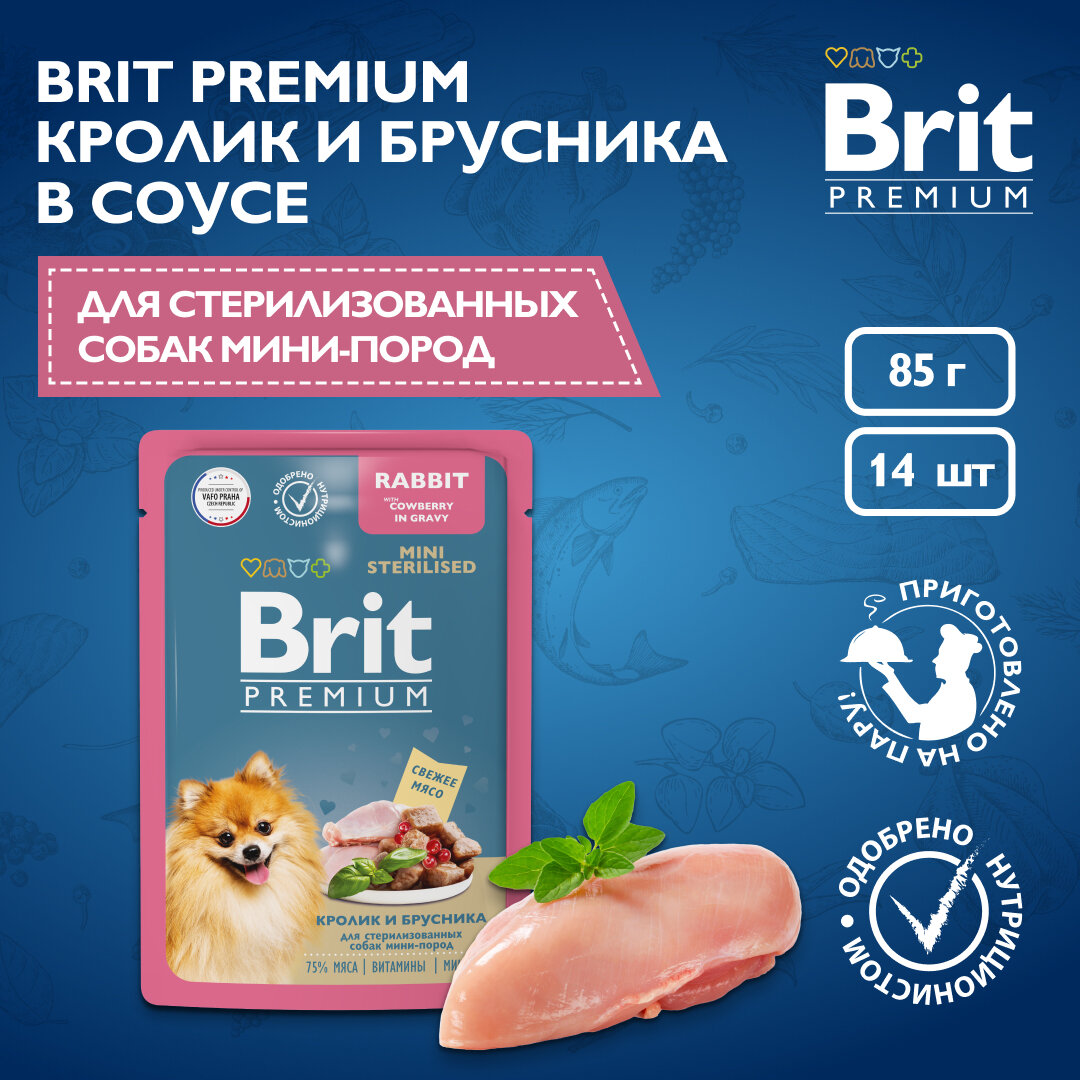 Влажный корм для собак Brit Premium для взрослых стерилизованных собак мини пород кролик и брусника в соусе, пауч 14 уп. х 85 г (для мелких пород)