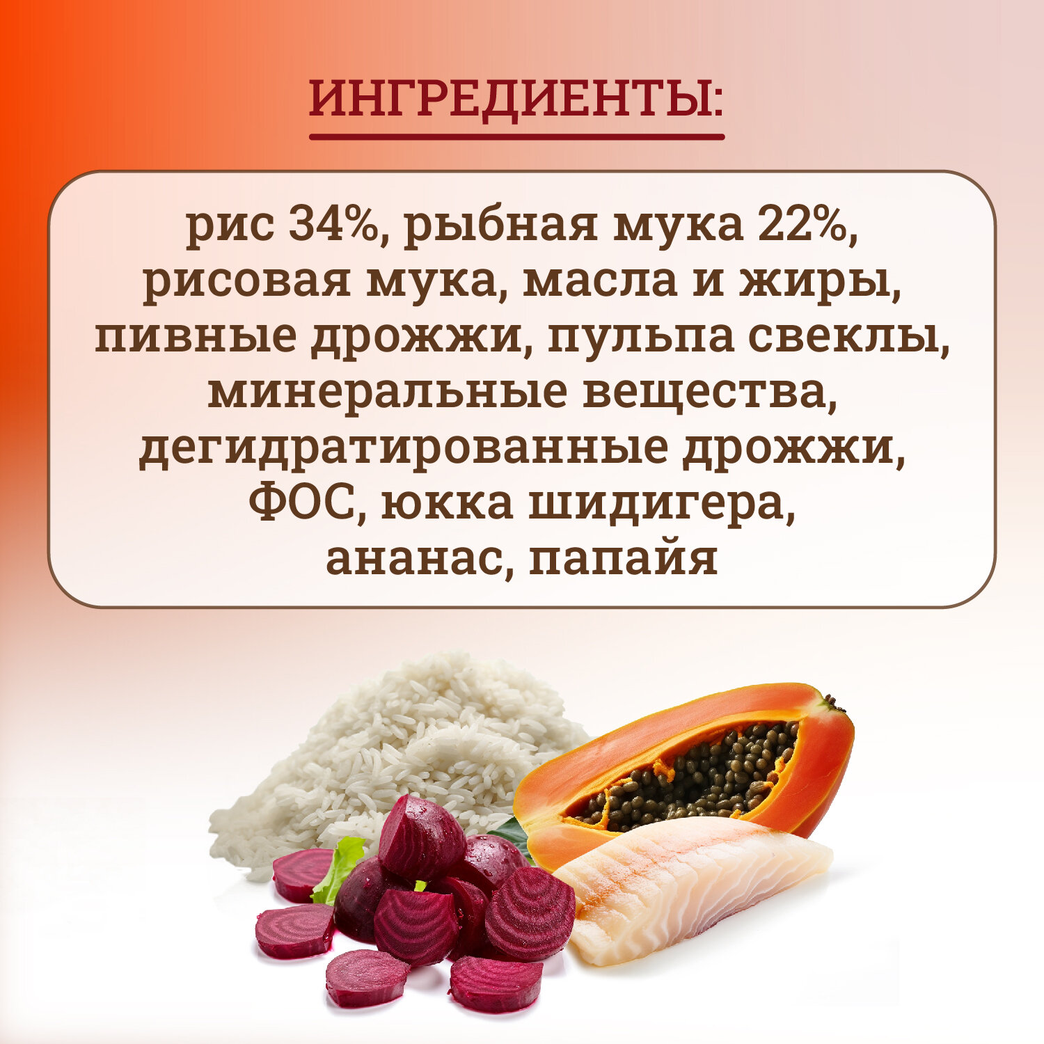 | Состав | рис – 34 %, рыбная мука – 21 %, рисовая мука, масла и жиры, пивные дрожжи, пульпа свеклы, минеральные вещества, дегидратированные дрожжи (Био МОС), ФОС, Юкка Шидигера, растительные жиры и масла (Elaeis guineensis), продукты, полученные в результате переработки растений (Ананас (Ananas spp.) – 0,025 %), продукты и субпродукты свежих фруктов и овощей (Папайя (Carica Papaya) – 0,0151 %) |