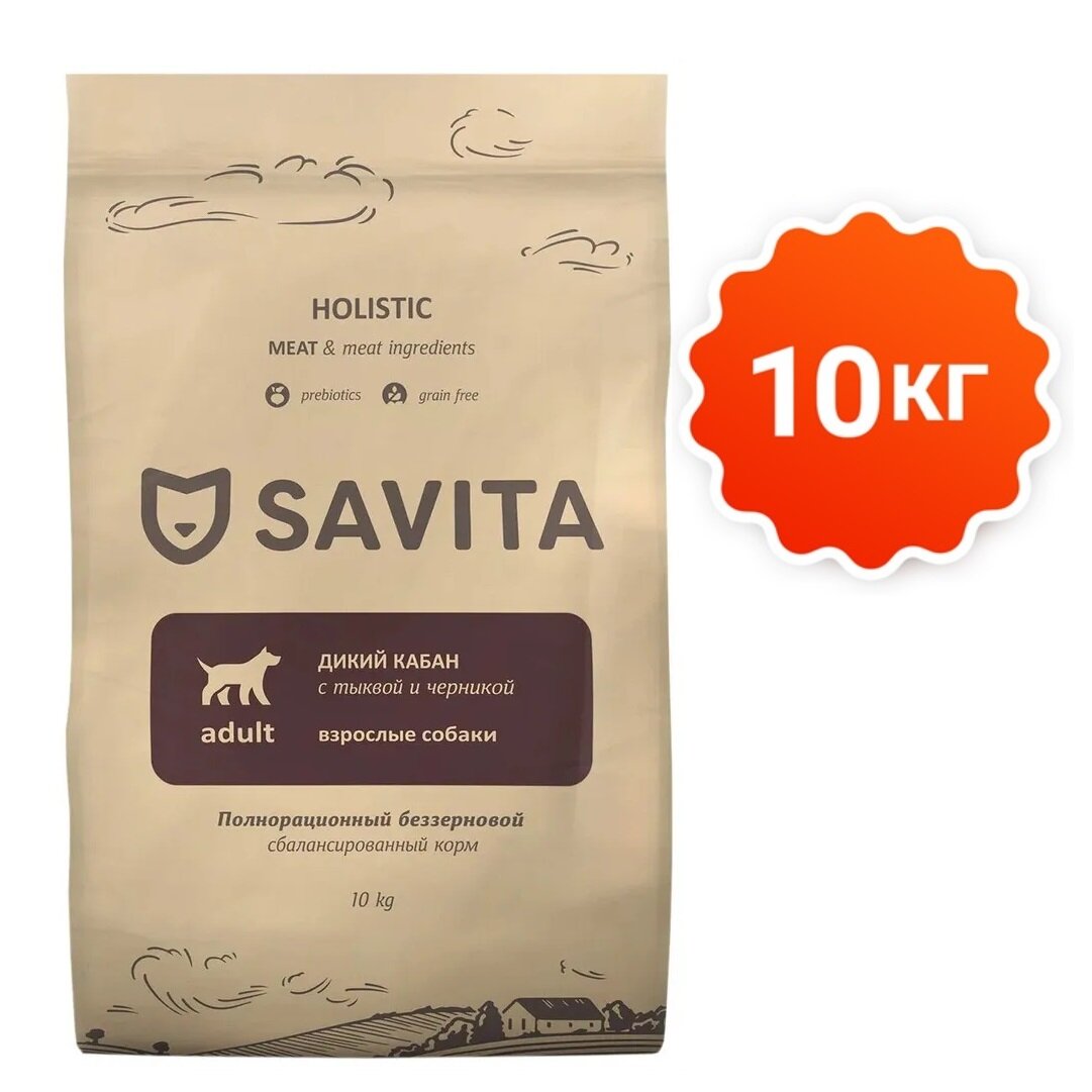 Сухой корм SAVITA беззерновой для взрослых собак с мясом дикого кабана, тыквой и черникой 10кг