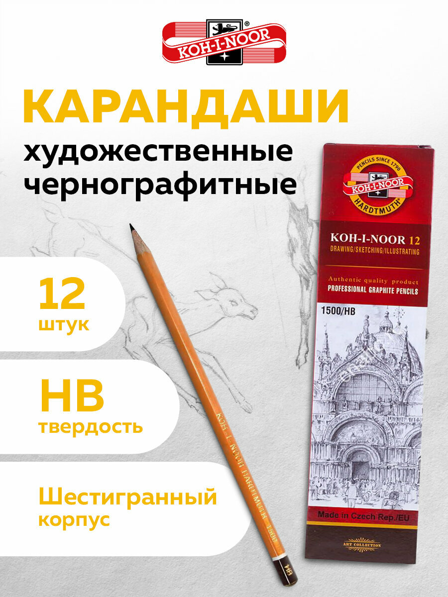 Карандаши простые чернографитные HB Koh-i-noor 1500, Комплект 12 штук, корпус желтый, 880470