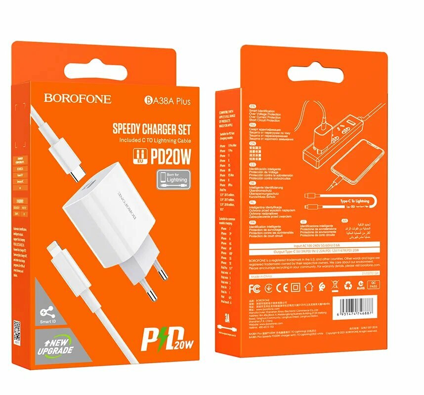 Купить Сетевое зарядное устройство Borofone BA38A Speedy + кабель Lightning, 20 W, белый