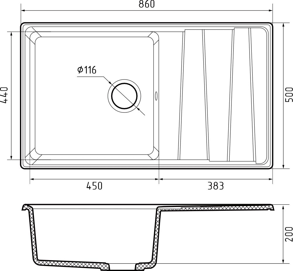 Мойка GRANFEST GF-LV--860L чаша+крыло 860*500 (черный - 308)