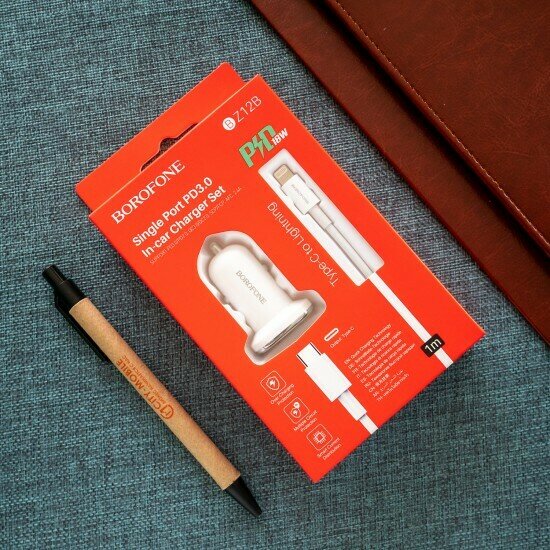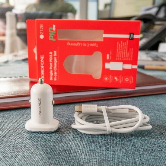 Автомобильное зарядное устройство Borofone BZ12B Lasting Power PD 18W, 3A + USB-C кабель Lightning 8-pin, 1м, белый