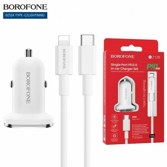 Автомобильное зарядное устройство Borofone BZ12B Lasting Power PD 18 Вт, 3 A + USB-C кабель Lightning 8-pin, 1м, белый