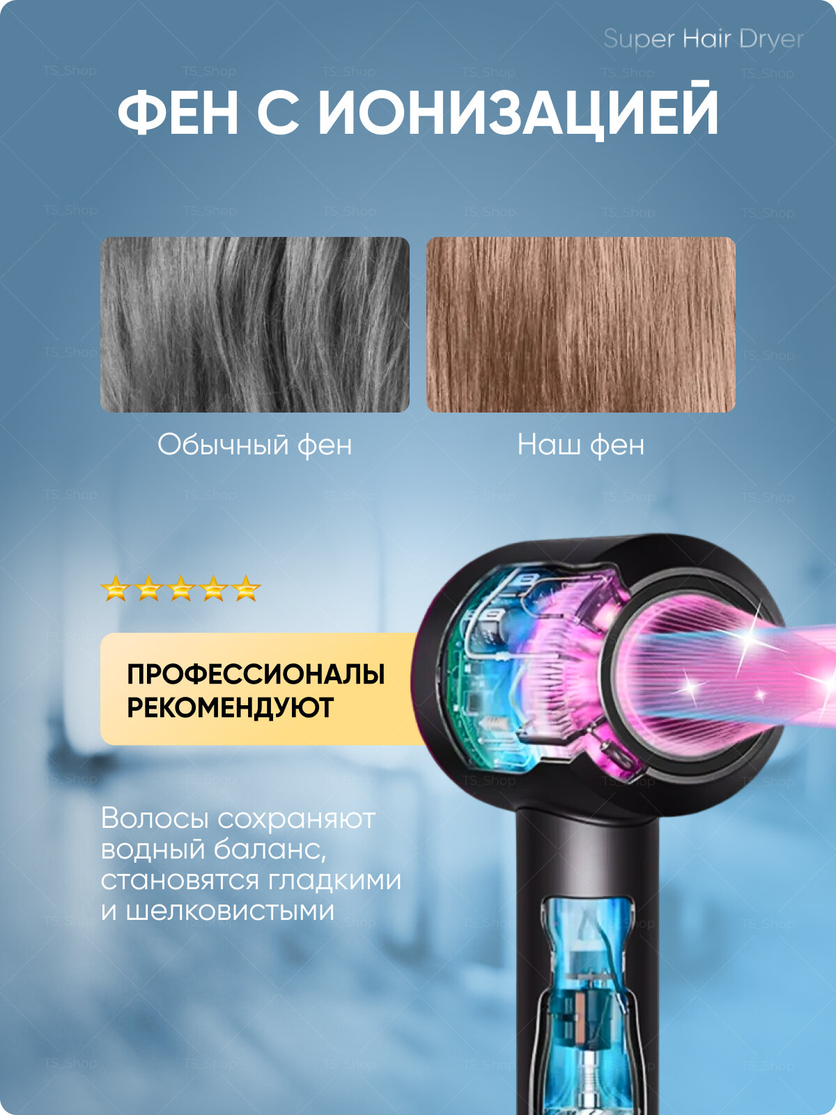 Профессиональный фен для волос Hair-1600 Super Hair Dryer 1600 Вт, 3 режима, 5 магнитных насадок, ионизация воздуха, розовый