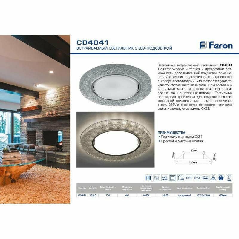 Светильник Feron CD4041 15W 4000K GX53 пр.хром 40518 интересное: