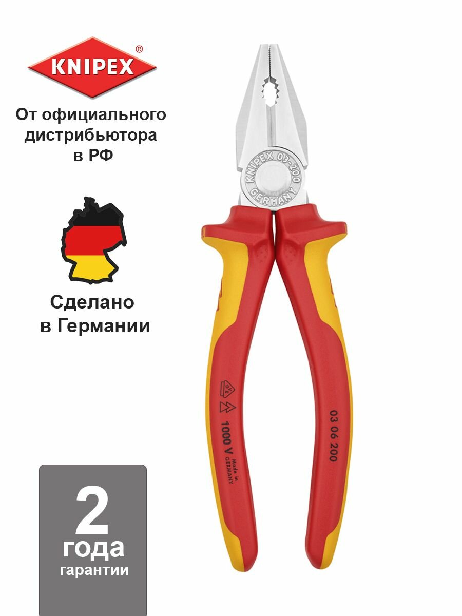 Плоскогубцы комбинированные VDE 1000V, резка - проволока средней твердости 3.8мм, твердая проволока 2.5мм, кабель 13мм (16мм), L=200мм, диэлектрические хромированные, двухкомпонентные рукоятки | код KN-0306200 | KNIPEX ( 1шт. )