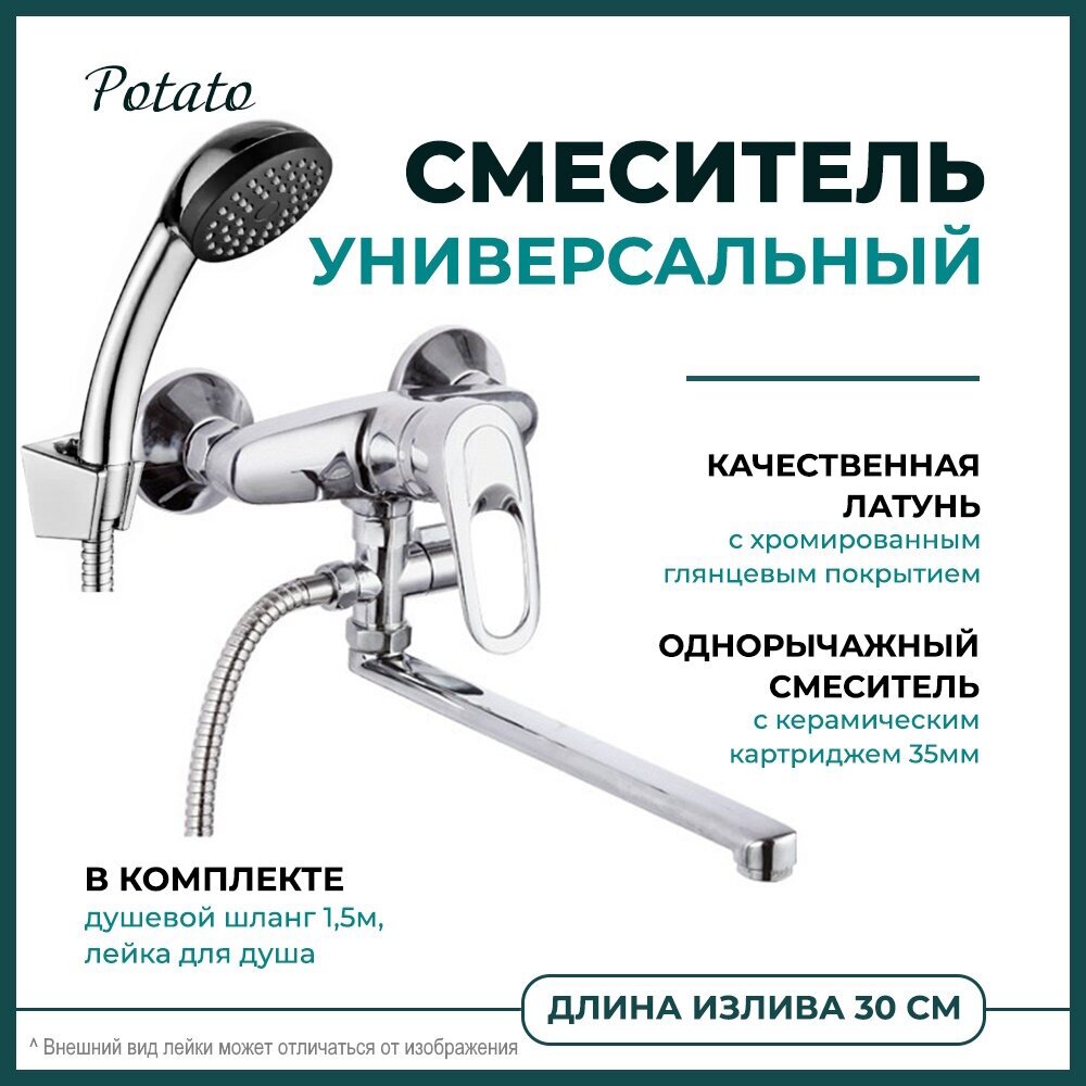 Смеситель унив. с плоск прям изл 350мм, к40, перекл. д/душа, Potato (Китай), арт P2125
