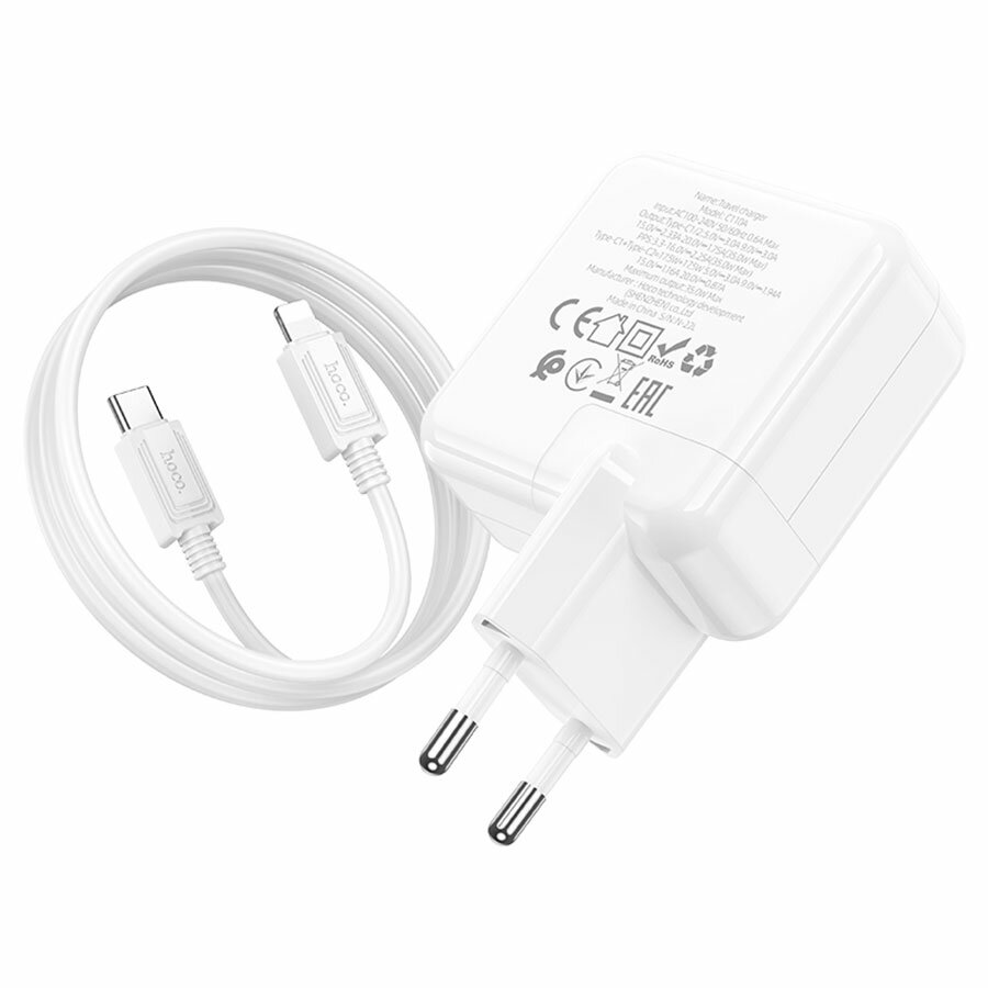 Купить Сетевое зарядное устройство HOCO C110A Lucky 2xUSB-C с Кабелем Type-C - Lightning, 3.0A, 35W, белый