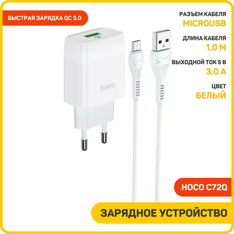 Сетевое зарядное устройство (СЗУ) Hoco C72Q (USB) + кабель MicroUSB, 3 А, белый
