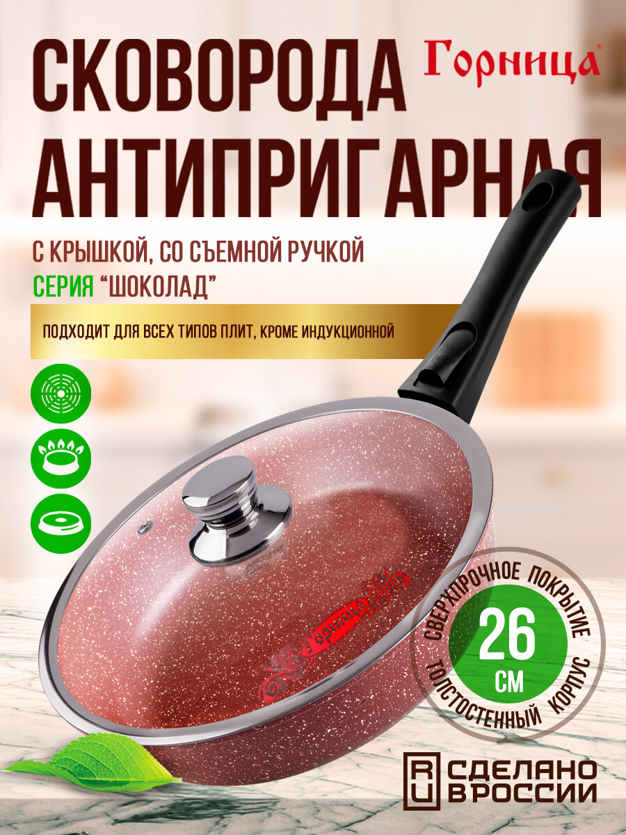 Сковорода антипригарная литая 26см со съемной ручкой и стеклянной крышкой Шоколад ТМ Горница