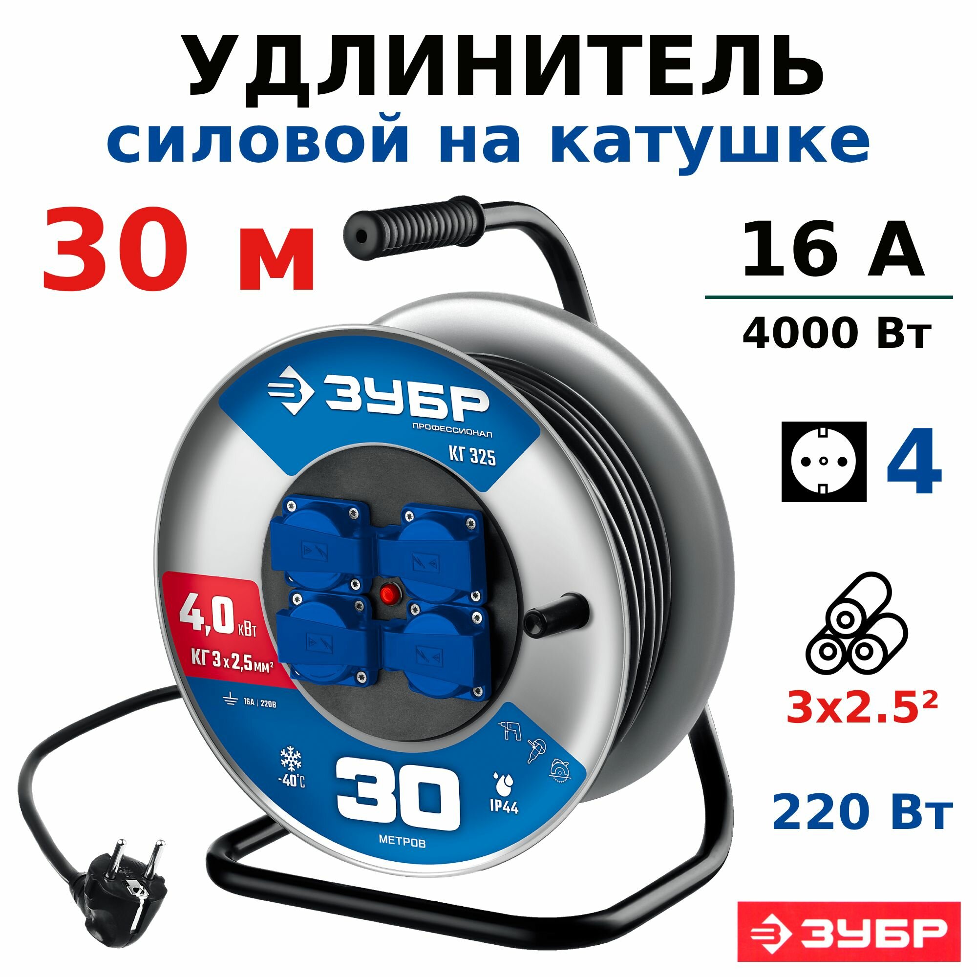 ЗУБР КГ-325, КГ, 3 x 2.5 мм2, 30 м, 4000 Вт, IP44, силовой удлинитель на стальной катушке, Профессионал (55079-30)
