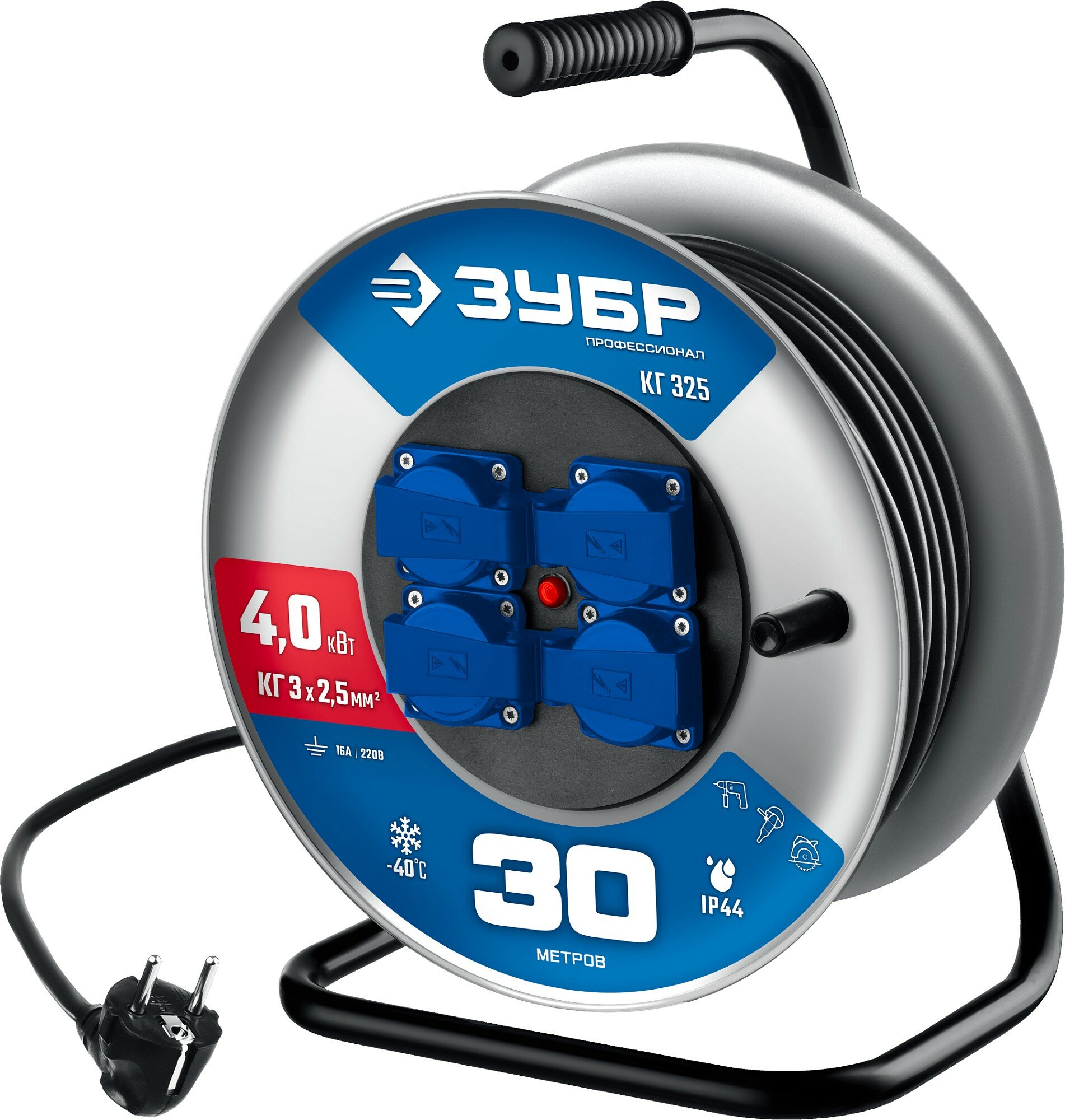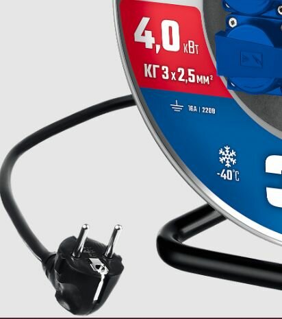 Силовой удлинитель на стальной катушке ЗУБР КГ 3х2.5 30м 4000Вт IP44, КГ 325
