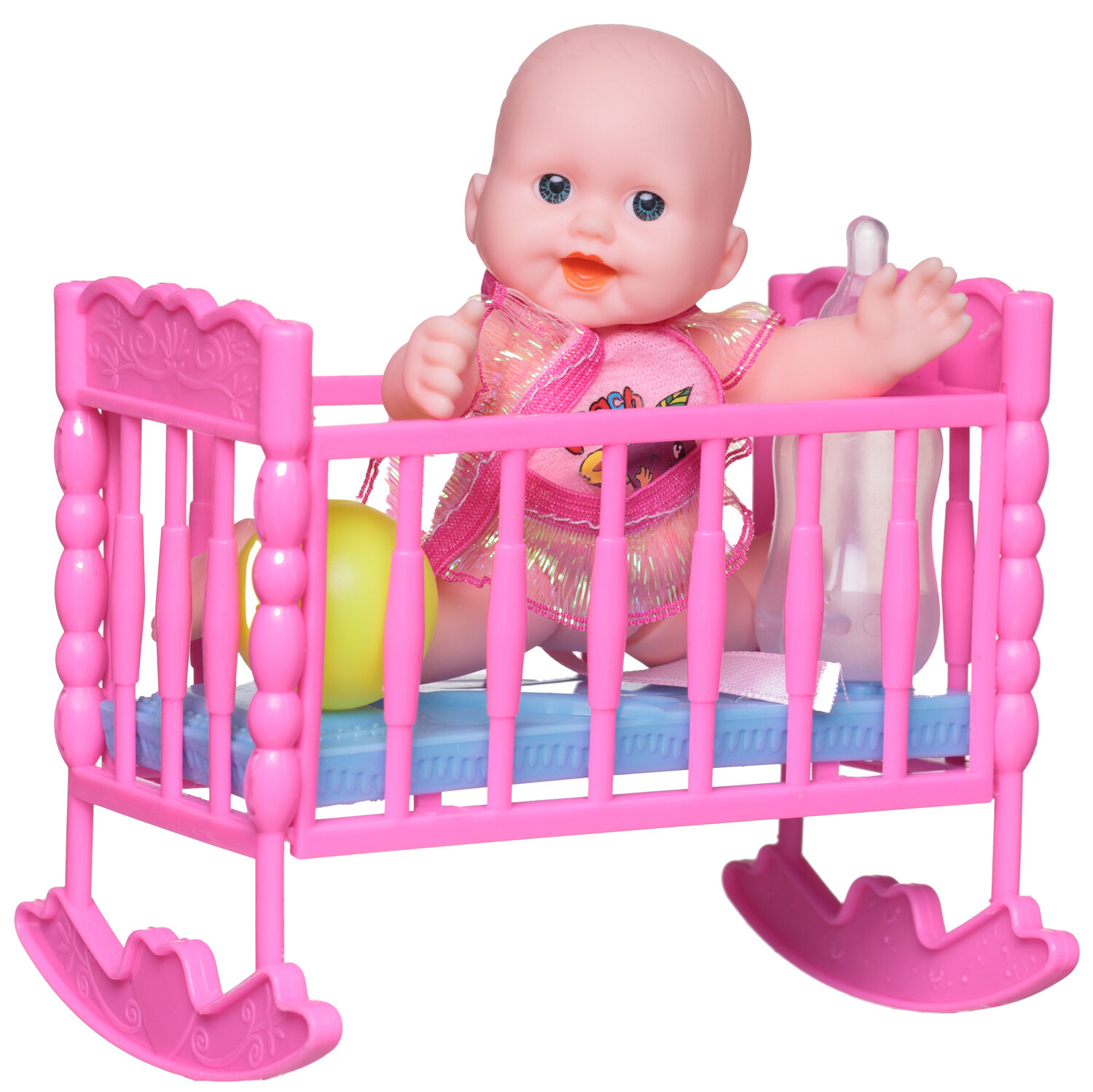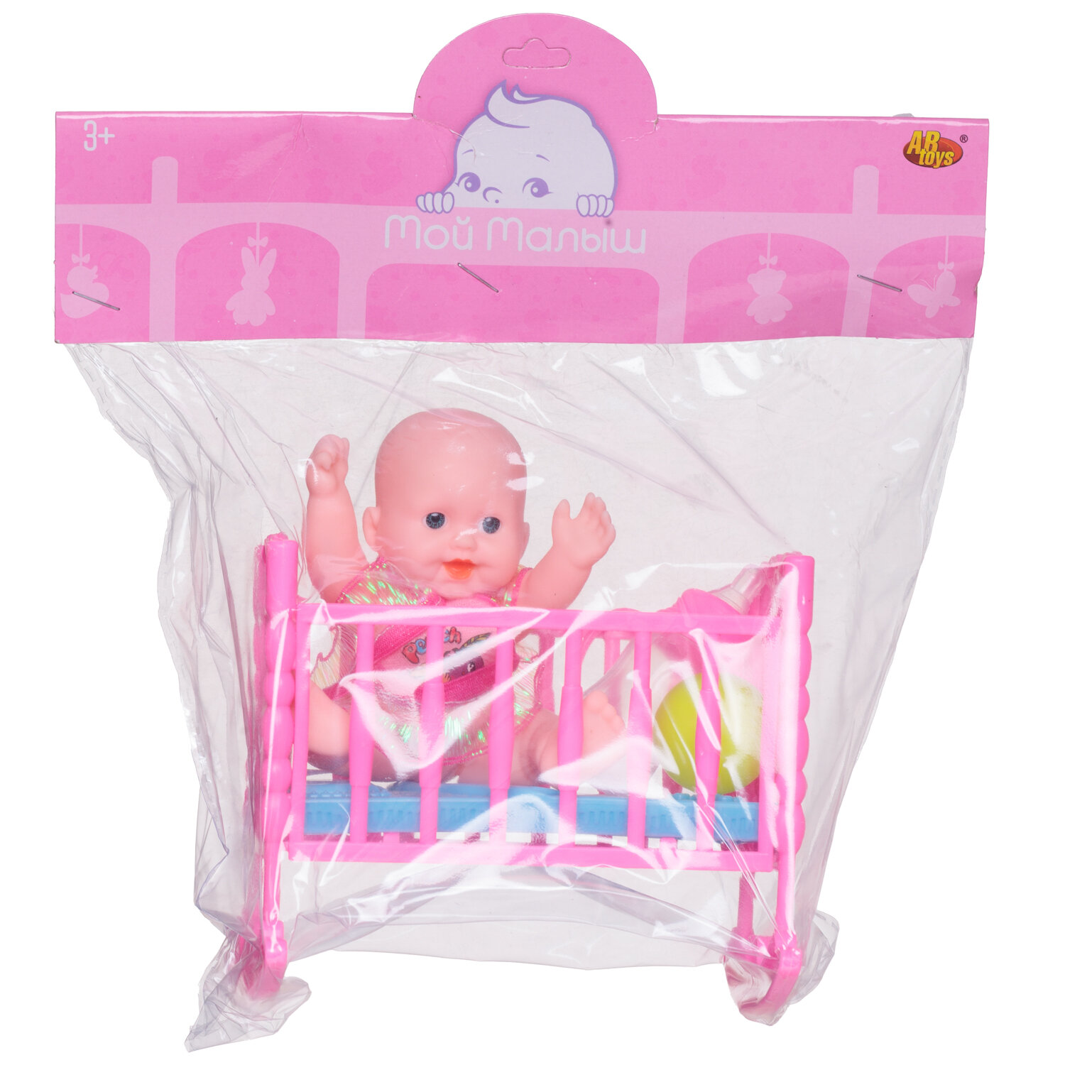 Пупс "Мой малыш", в наборе с кроваткой (пупс, кроватка, мячик, бутылочка молока), в пакете