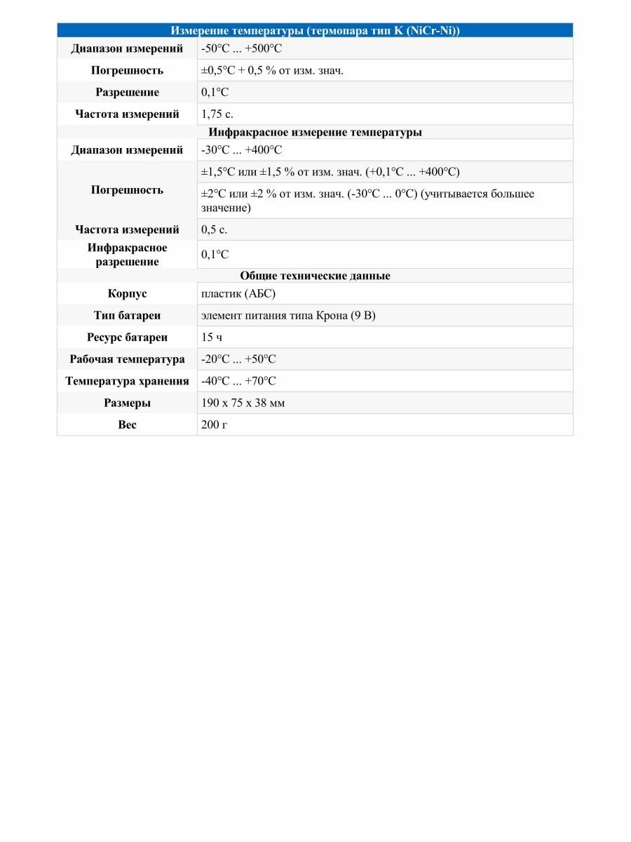 | Максимальная определяемая температура | 400 °C |