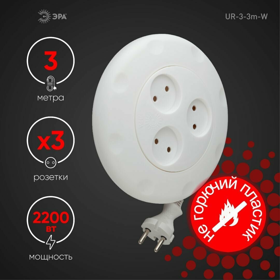 Купить ЭРА Б0019038 Удлинитель-рулетка UR-3-3m-W Calypso без заземления белый 3 гнезда 3 м полипропилен, 2 .