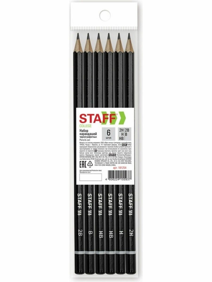 Карандаши чернографитные STAFF "College" BLP-254, набор 6 шт., 2H-2B, черный корпус, 181254