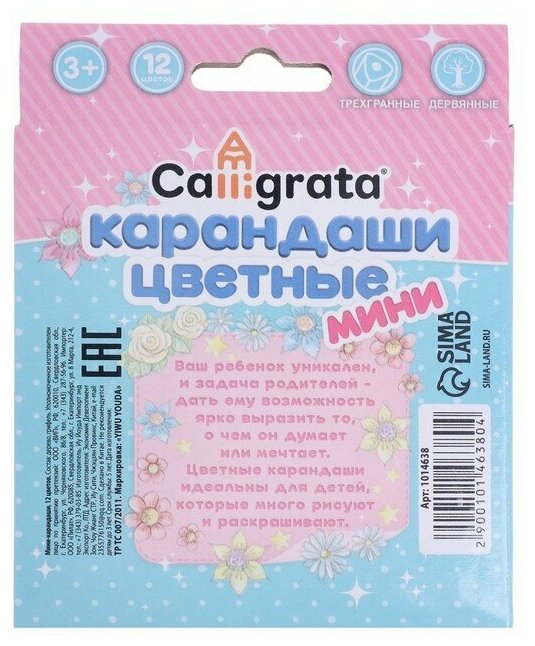 Карандаши цветные Calligrata "мини" в картонной коробке "Принцесса" 12 цветов, корпус треугольный (деревянный)