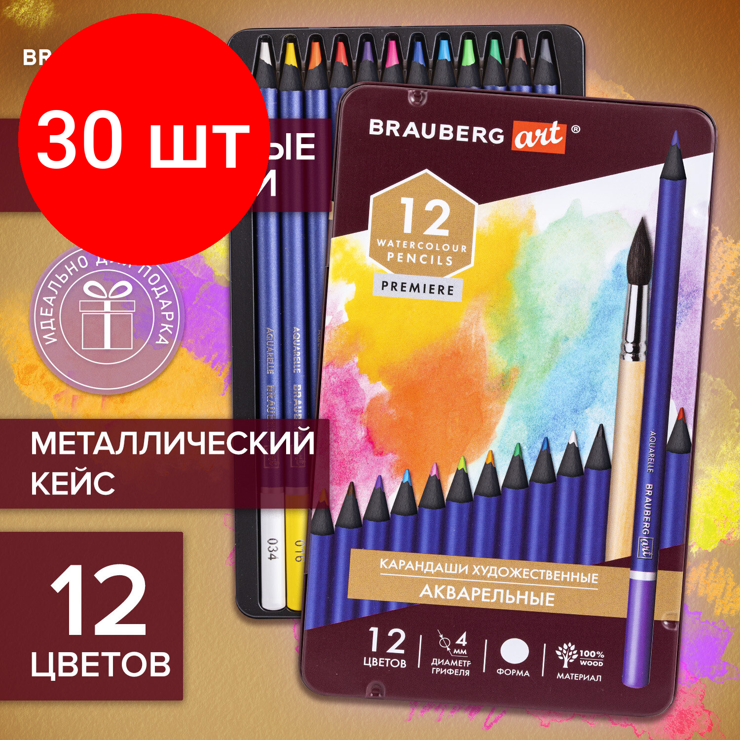Купить Карандаши художественные цветные акварельные BRAUBERG ART PREMIERE, 12 цветов, грифель 4 мм, металл, 181533 Комплект - 3 шт.