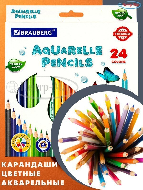 Карандаши цветные акварельные BRAUBERG PREMIUM AQUARELLE, 24 цвета, грифель мягкий 4 мм, 181673 В комплекте: 1шт.
