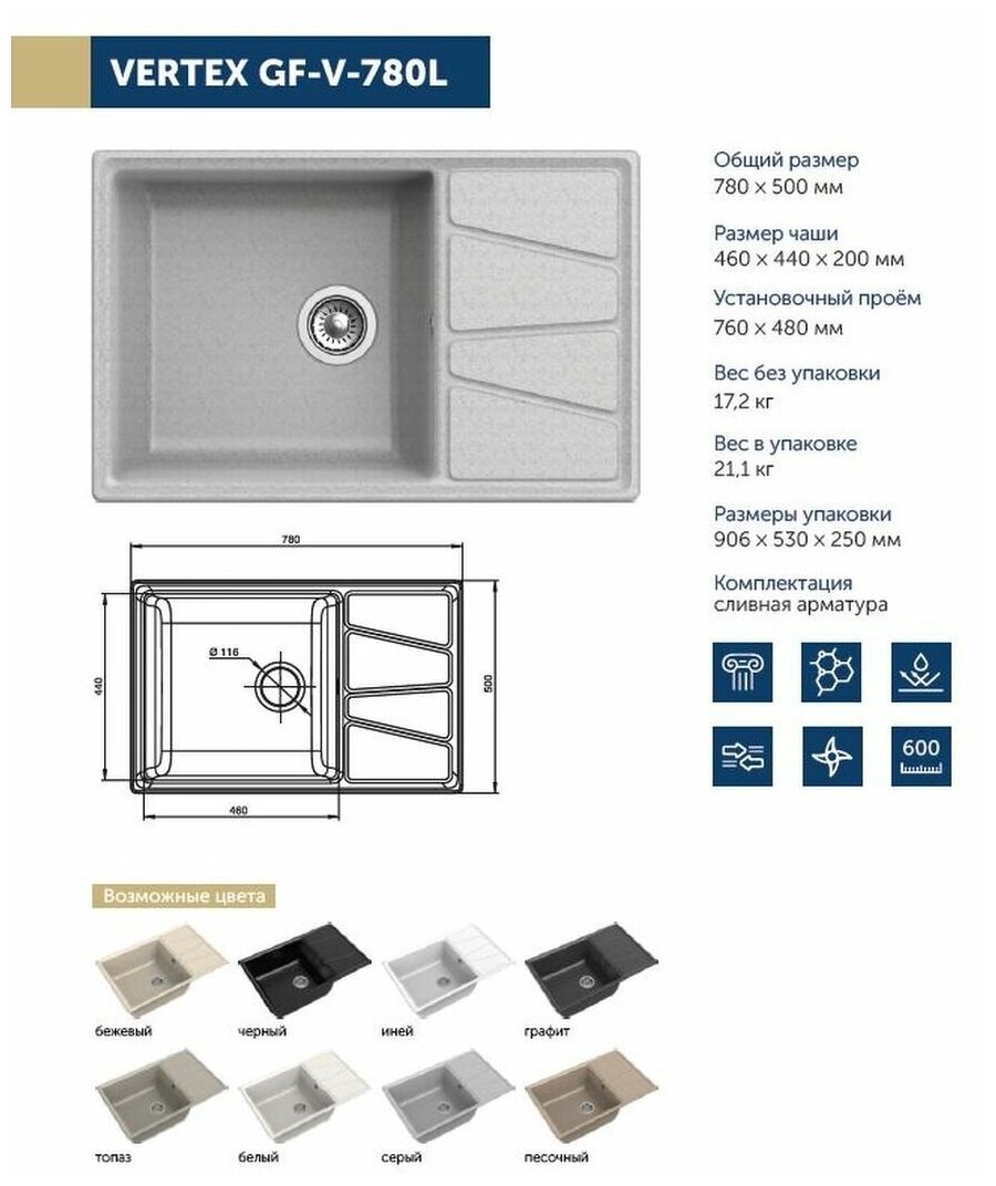 Мойка кухонная GranFest Vertex Gf-v-780l топаз .