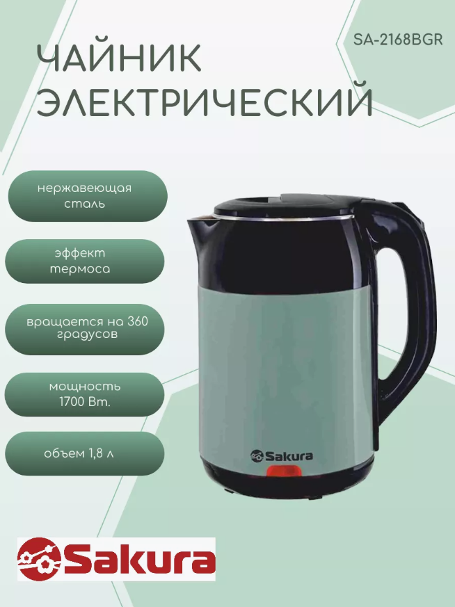 Чайник электрический Sakura SA-2168BGR двухслойный, черный/зеленый 1.8л