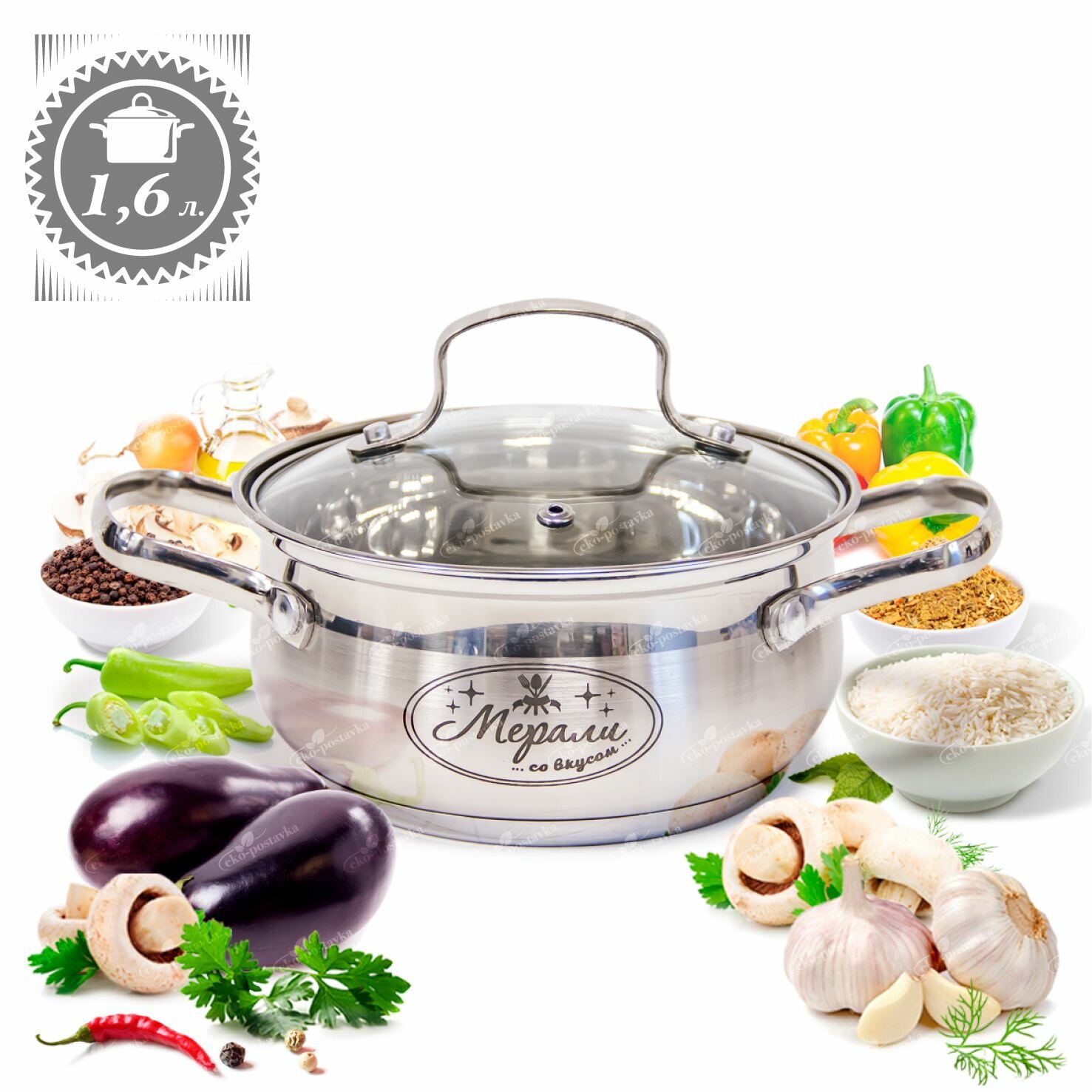 Кастрюля Мерали 1,6 л 16 см из нержавеющей стали со стеклянной крышкой для газовых, электрических и индукционных плит