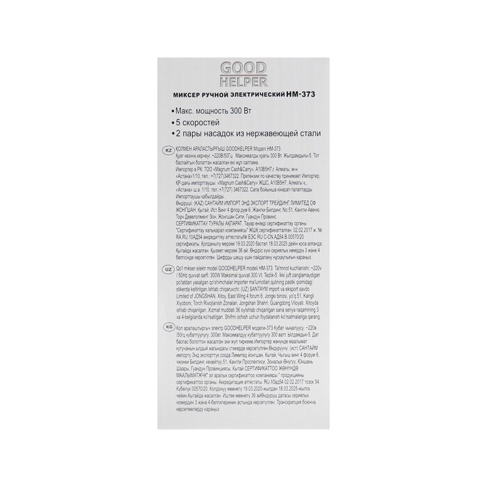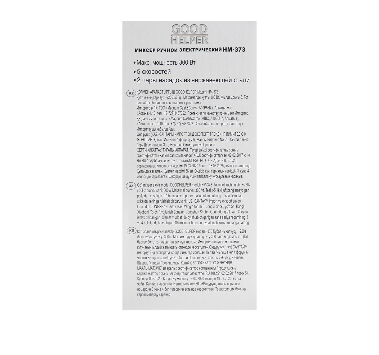 Миксер ручной кухонный GOODHELPER HM-373 / 300 Вт