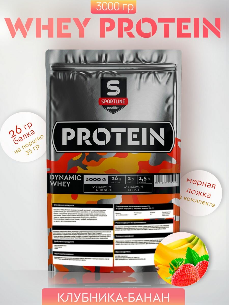 Протеин SportLine Dynamic Whey Protein 85%, Клубника-банан, спортивное питание, 3000 г