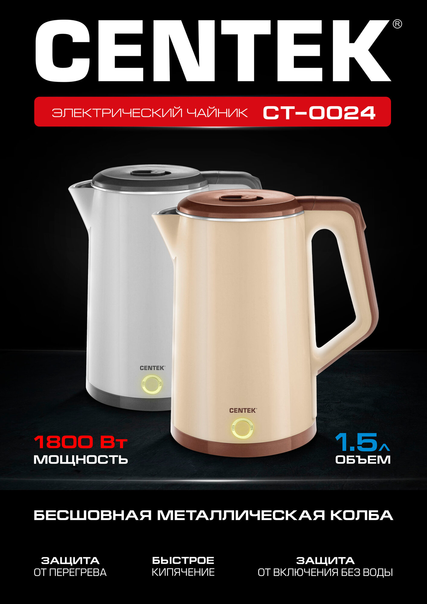 Чайник Металлический Centek Ct-0024 Beige, 1,5Л, 1800Вт CENTEK арт. CT0024Beige