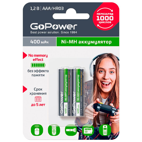 Батарейки GoPower Аккумулятор бытовой HR03 AAA BL2 NI-MH 400mAh (2/20/320) блистер (2 шт.)
