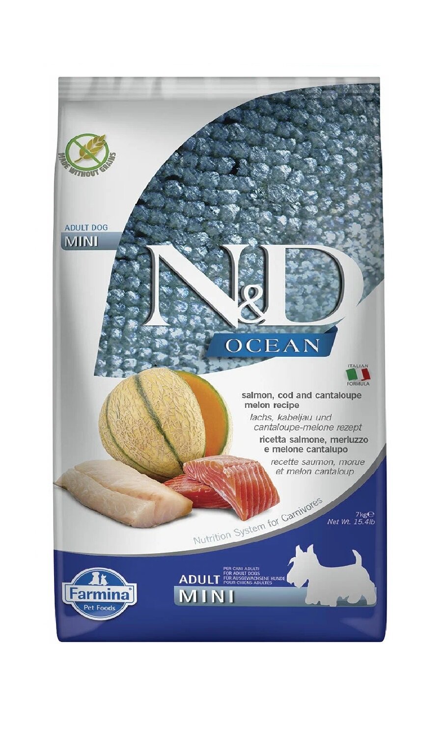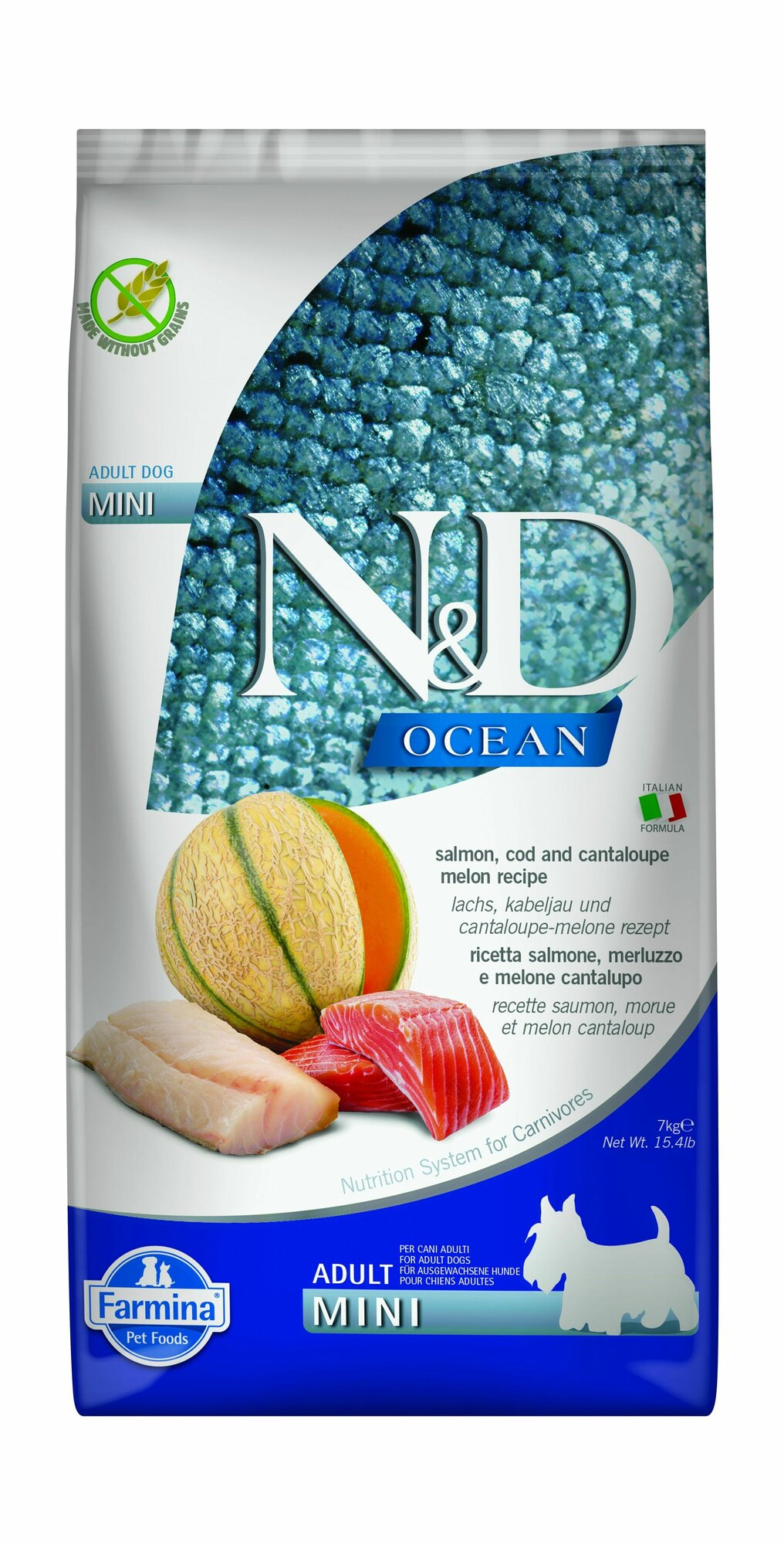Farmina N&D Ocean Dog Salmon, Codfish & Cantaloupe Melon Adult Mini сухой беззерновой корм для взрослых собак мелких пород с лососем, треской и дыней - 7 кг
