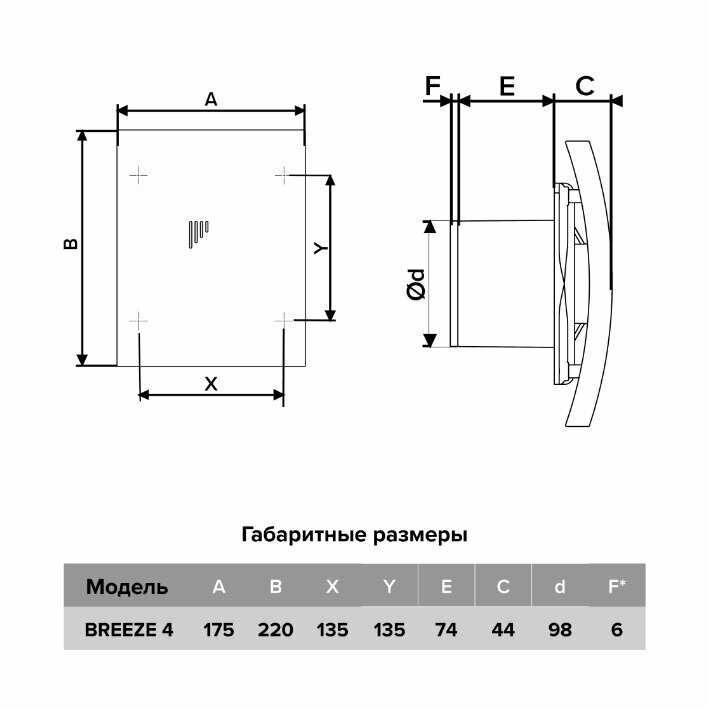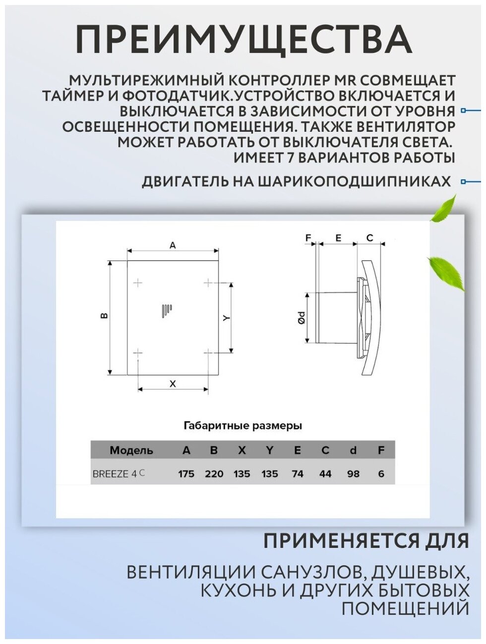 BREEZE 4C MRH вентилятор вытяжной бесшумный вытяжной с таймером и датчиком влажности, c обратным клапаном на шарикоподшипниках D98