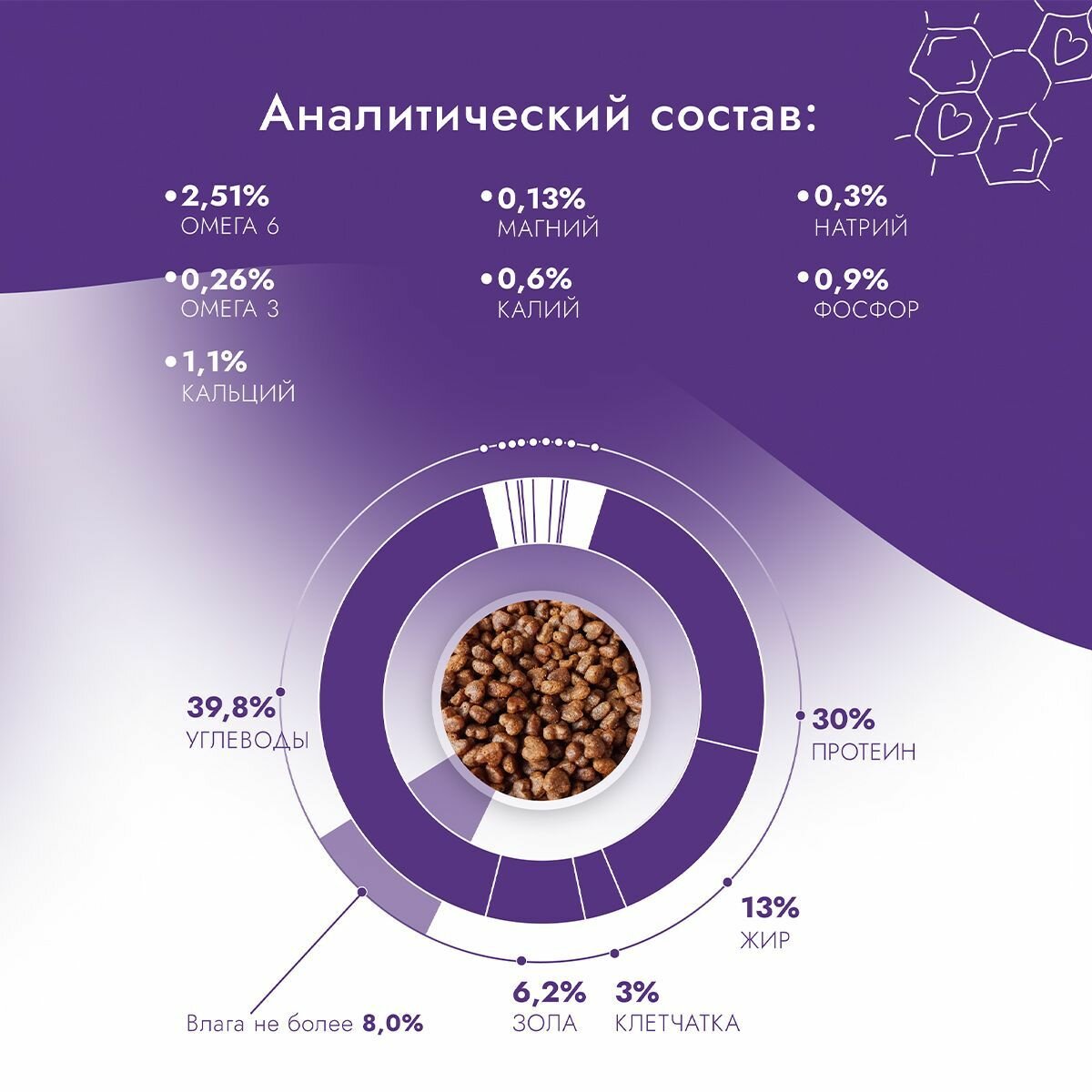 | Минеральные вещества | 1,3% кальций, 0,9% фосфор, 0,6% калий, 0,3% натрий; на 1 кг: железо (сульфат железа моногидрат) 50 мг, марганец (оксид марганца) 10 мг, медь (сульфат меди, пентагидрат) 10 мг, цинк (сульфат цинка, моногидрат) 100 мг, йод (йодат кальция, безводный) 3,0 мг, селен (селенит натрия) 0,2 мг, омега-3 жирные кислоты 0,23%, омега-6 жирные кислоты 2,56% |