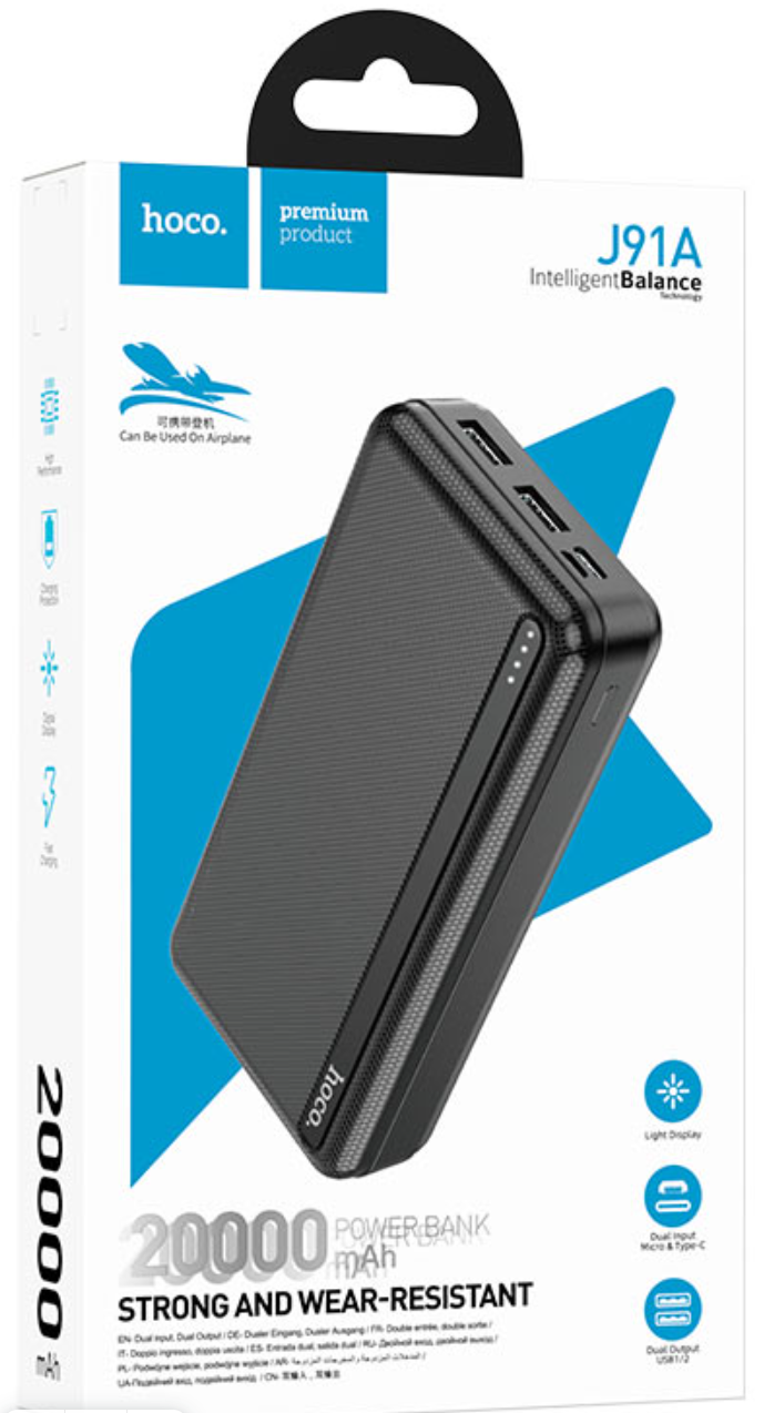 | Дополнительная информация | J91A, мобильный блок питания, 20000 мАч, вход Micro-USB / Type-C 2A, выход dual USB 5V / 2.1A, со светодиодным индикатором |